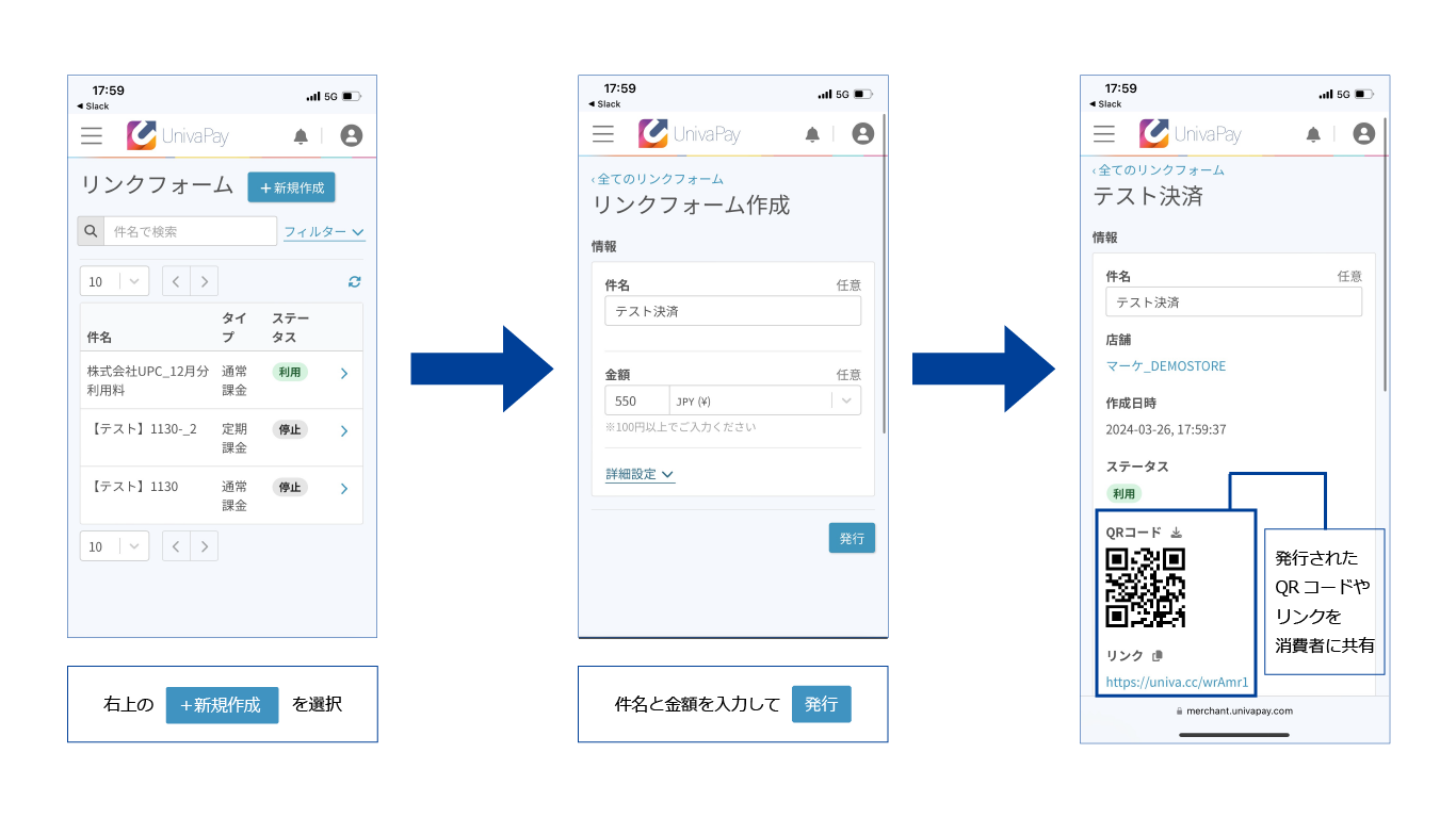 UnivaPayリンクフォームの場合は、管理画面から3ステップでフォームを発行することができます。